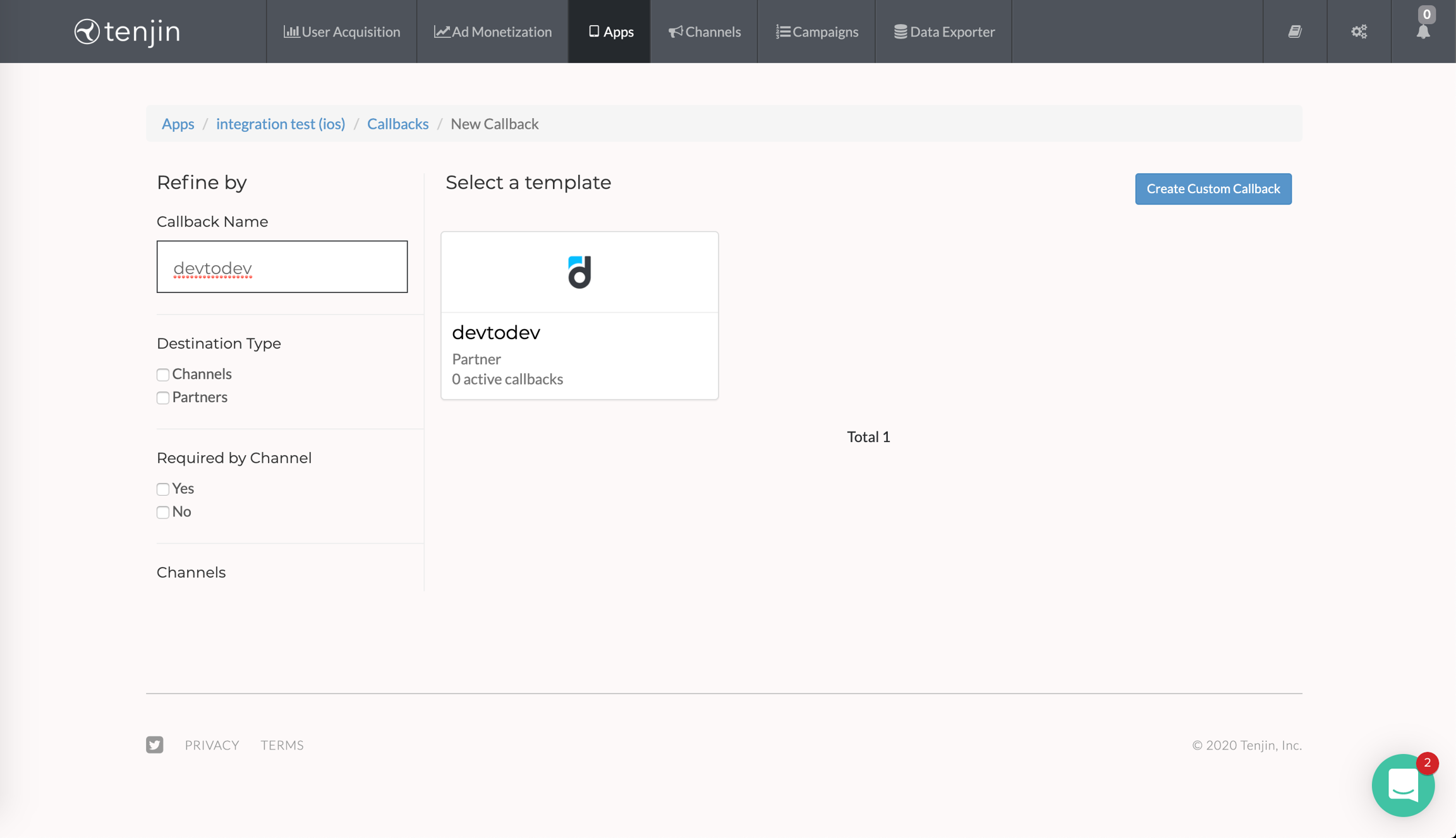 In Tenjin, enter API Key in the new callback form.