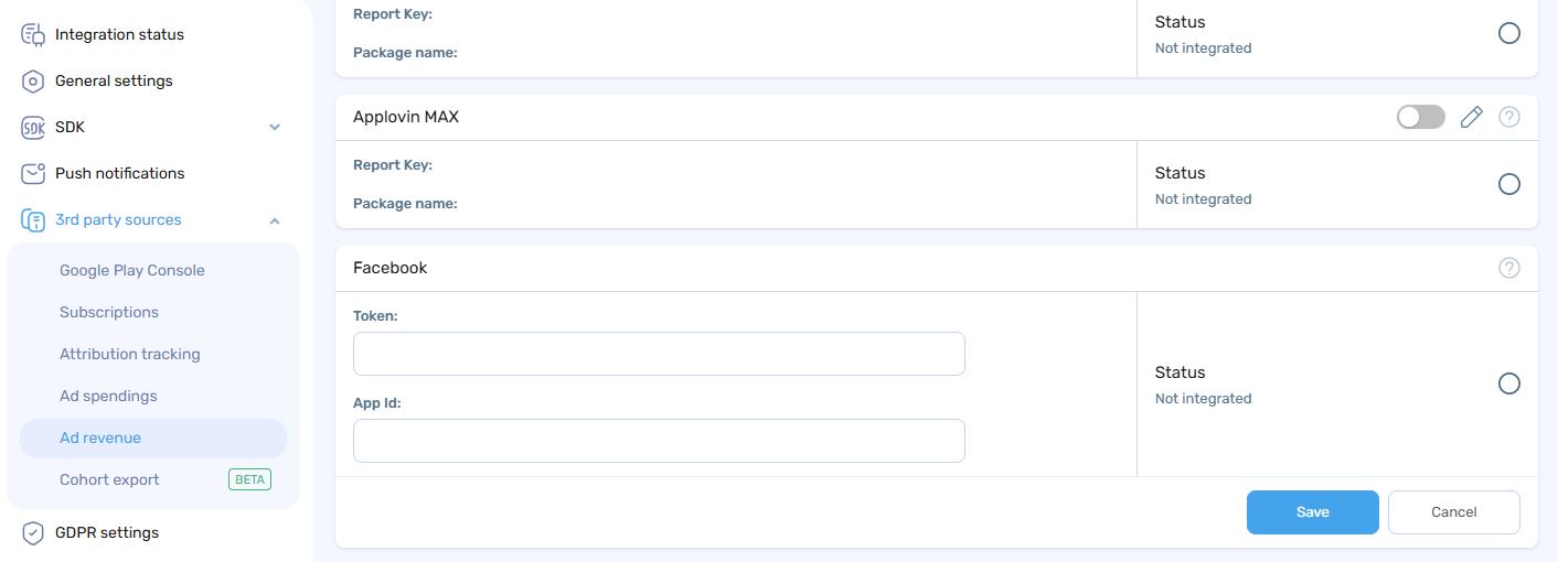 After you have obtained **Access token** and **App ID**, go to devtodev (Settings -> 3rd party sources -> Ad revenue), copy values there and enable integration:&#x20;