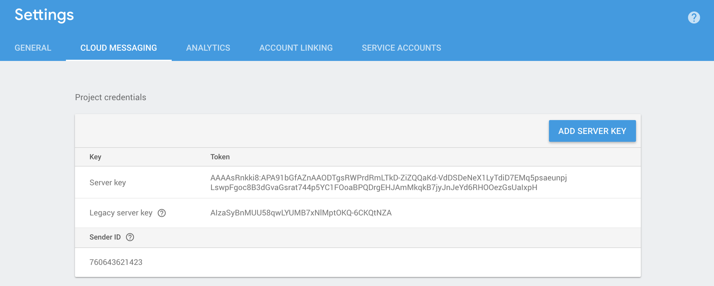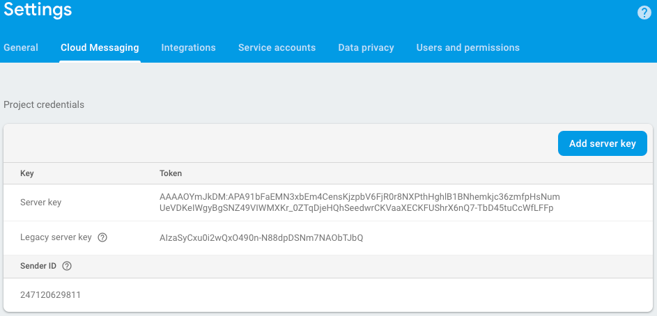Remember or copy Server key and Sender ID from the Cloud Messaging tab. You will need them to integrate push notifications and create push campaigns.