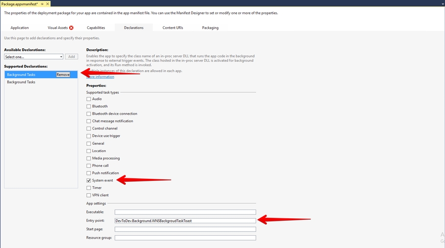 protected override void OnLaunched(LaunchActivatedEventArgs e) { //...other source DevToDev.PushManager.HandleToastNavigation(e.Arguments); } protected override void OnActivated(IActivatedEventArgs args) { //...other source if (args.Kind == ActivationKind.ToastNotification) { var toastArgs = args as ToastNotificationActivatedEventArgs; DevToDev.PushManager.HandleToastNavigation(toastArgs.Argument); } }Make sure that these functions are enabled in Package.appmanifest of you project (the flag "Toast capable" is enabled by default for Windows 10+ projects, it is absent in the manifest).