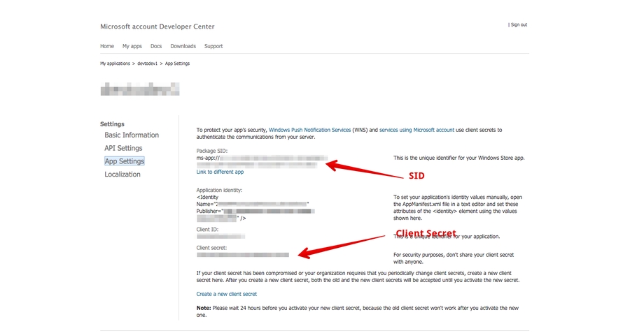 Activate Windows Messaging Service ang get SID and Client Secret values