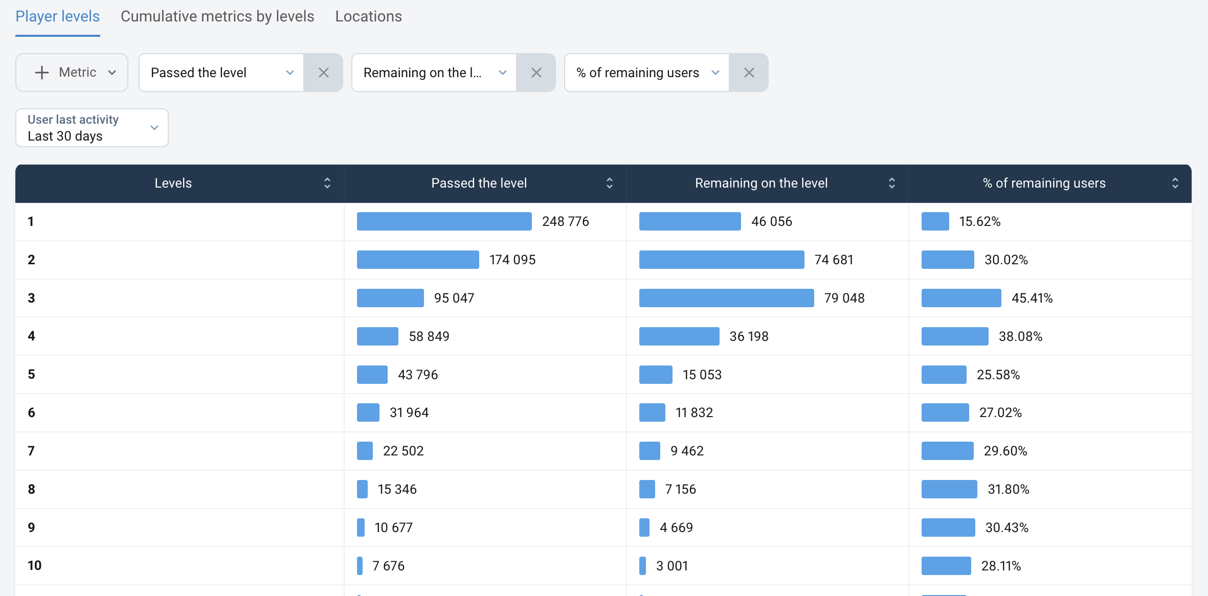 On the **Player levels** tab add these metrics to the report: Passed the level, Remaining on the level and % of remaining users.&#x20;
