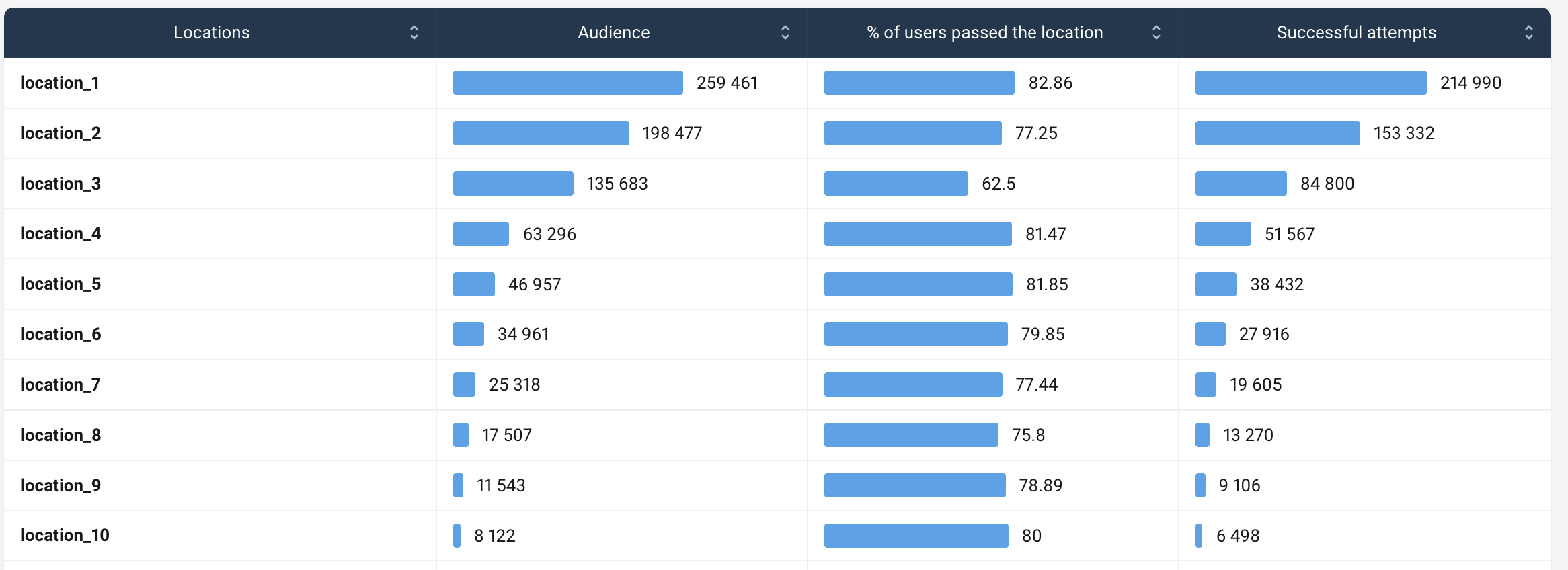 Now we’ll build a report not in the terms of levels, but game locations (**Locations** tab). During a certain attempt to complete a level, the users may change various numerical indicators: resources, game currency, etc. The report will show the distribution of players by locations and user flow in these sections. We can track the change in any numerical parameter of the location in terms of successful or unsuccessful attempt (these can be steps, health units, boosters, etc.).